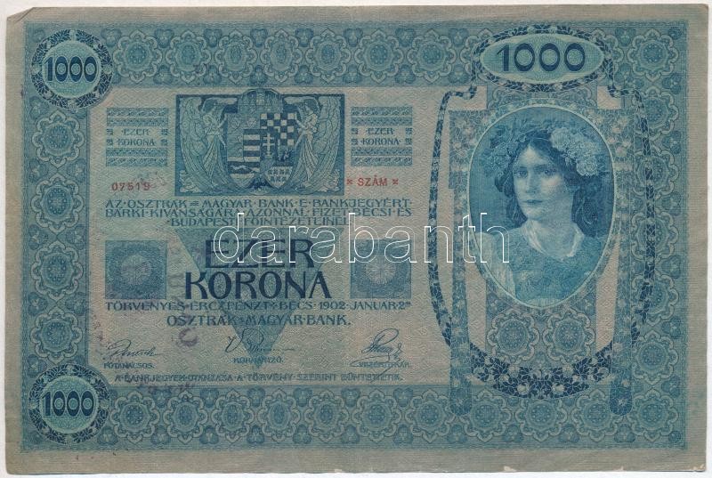 1902. 1000K rajta kiolvashatatlan, halovány bélyegzés T:III szép papír... https://www.darabanth.com/hu/303-Gyorsarveres/303.0/Numizmatika/Magyar-bankjegyek~300007/1902-1000K-rajta-kiolvashatatlan-halovany-belyegzes-TIII-szep-papir---Adamo-K35~II1630550
