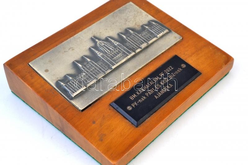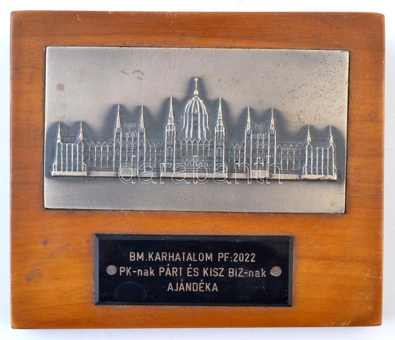 ~1970-1980. A magyar Parlamentet ábrázoló fém plakett fa talpon, "BM. KARHATALOM - PK-nak PÁRT ÉS KISZ BIZ-nak AJÁNDÉKA" táblával (plakett: 64x119mm fatalp: 127x149mm) T:2