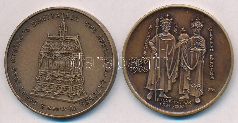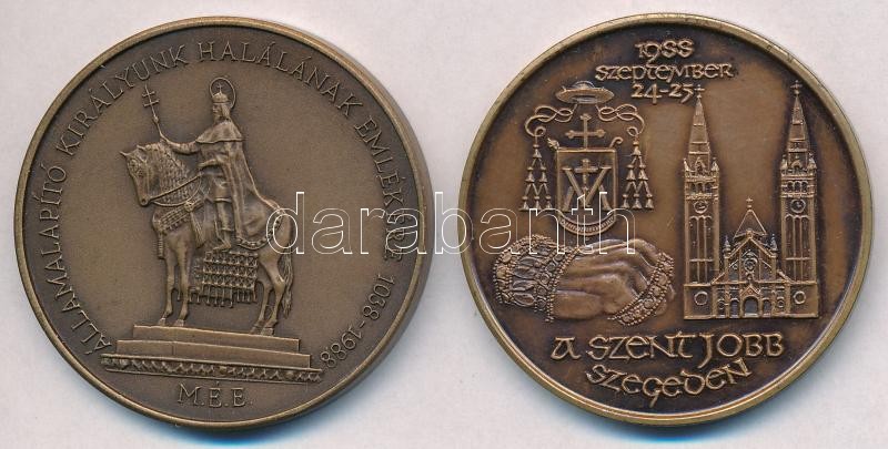 Bognár György (1944-) 1988. "MÉE - Államalapító királyunk emlékére / A Szent Jobb országos bemutatása" Br emlékérem (42,5mm) + Fritz Mihály (1947-) / Szabó Géza (1939-) 1988. "MÉE Szeged / A Szent Jobb Szegeden" Br emlékérem (42,5mm) T:1-,2