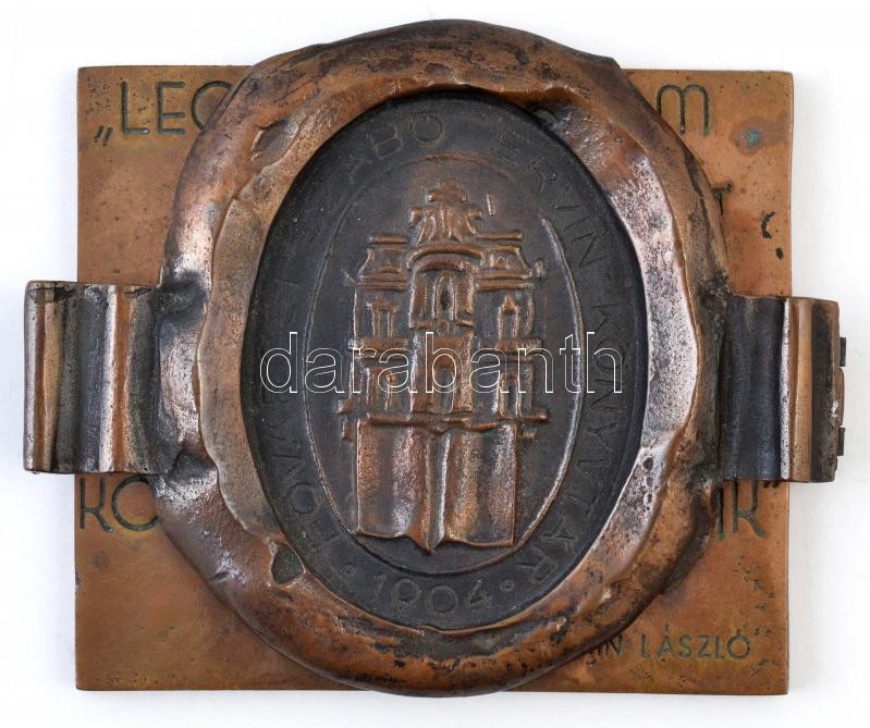 Leírás: DN "Fővárosi Szabó Ervin Könyvtár 1904 / Legjavam adtam át a kornak - Benjámin László" Br plakett, kinyitható (~111x135mm) T:2 kis patina