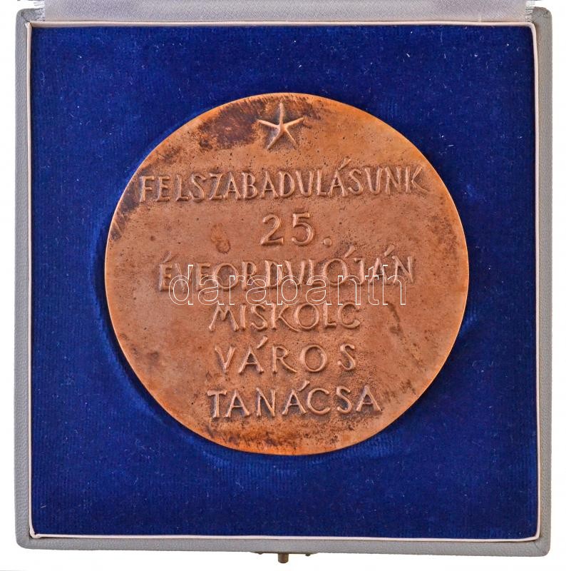 Leírás: Kiss Kovács Gyula (1922-1984) 1970. "Felszabadulásunk 25. évfordulóján - Miskolc város Tanács" Br plakett tokban (97mm) T:2 oxidáció