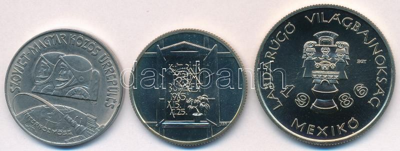 Leírás: 1980. 100Ft Ni "Szovjet-magyar közös űrrepülés" + 1985. 100Ft alpakka "Kulturális Fórum" + 1985. 100Ft Cu-Ni-Zn "Labdarúgó Világbajnokság Mexikó" T:BU