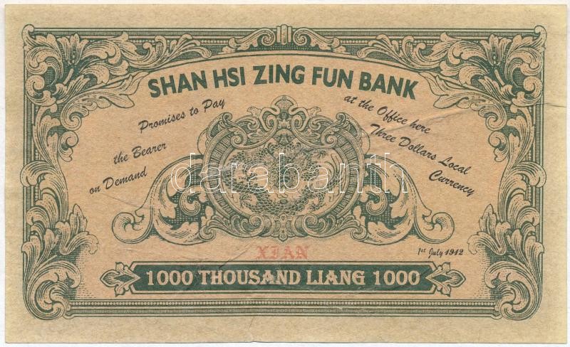 Leírás: Kína ~1912. 1000L "Shan Hsi Zing Fun Bank" fantáziapénz T:III,III-