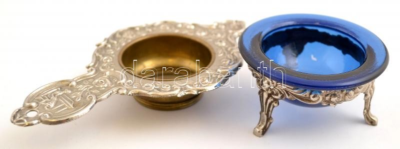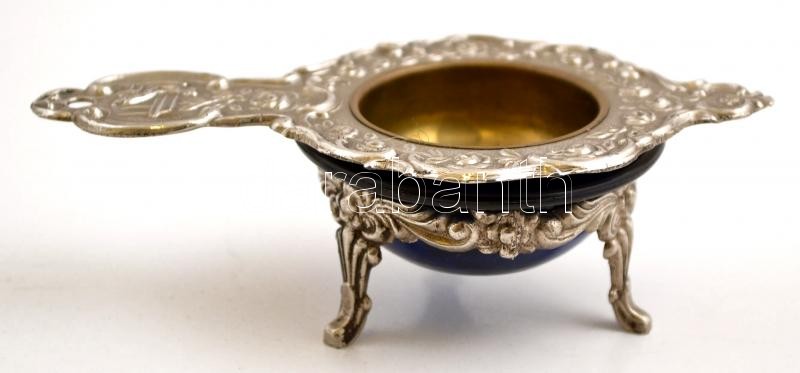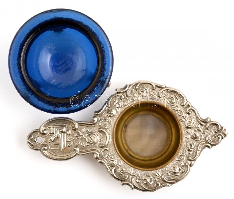 Leírás: Dekoratív fém szűrő, fémtalpas üveg tartóval, 12×7×4 cm