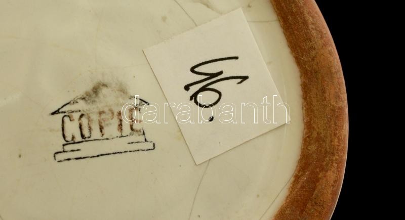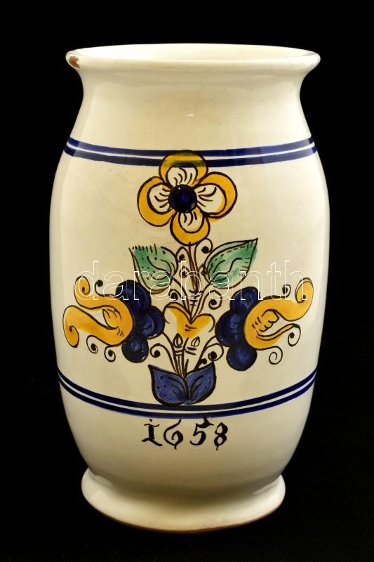 Leírás: Habán stílusú patikaedény, replika, kézzel festett, jelzett, lepattanással, m: 17 cm