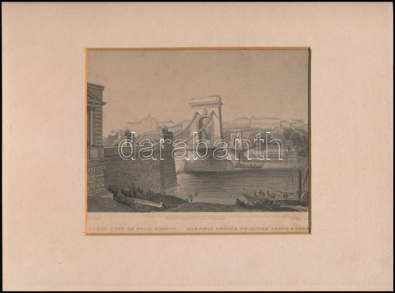 Leírás: cca 1848 Ludwig Rohbock (1820-1883): Budapest, az új Lánchíd acélmetszet paszpartuban / steel-engraving 17x14 cm