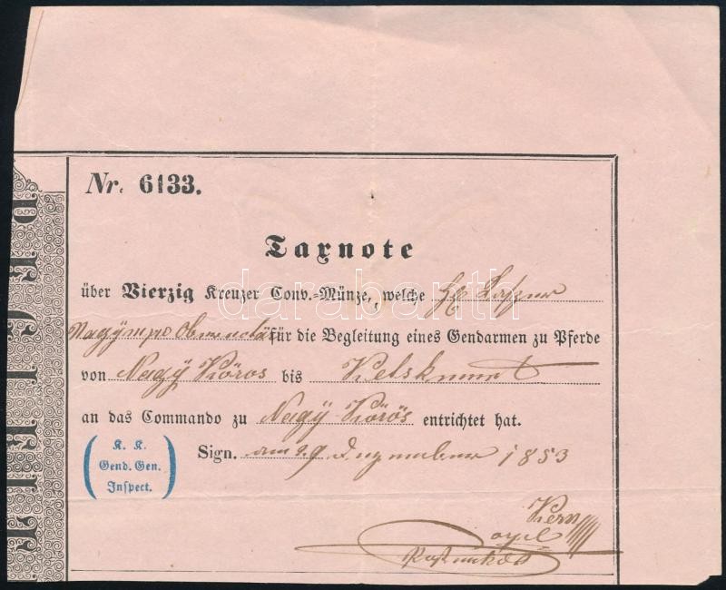 1853 Csendőrség számára kölcsönadott lóról szóló nyugta. https://www.darabanth.com/hu/304-Gyorsarveres/304.0/Festmeny-mutargy-papirregiseg-egyeb/Militaria~26/1853-Csendorseg-szamara-kolcsonadott-lorol-szolo-nyugta~II1637494