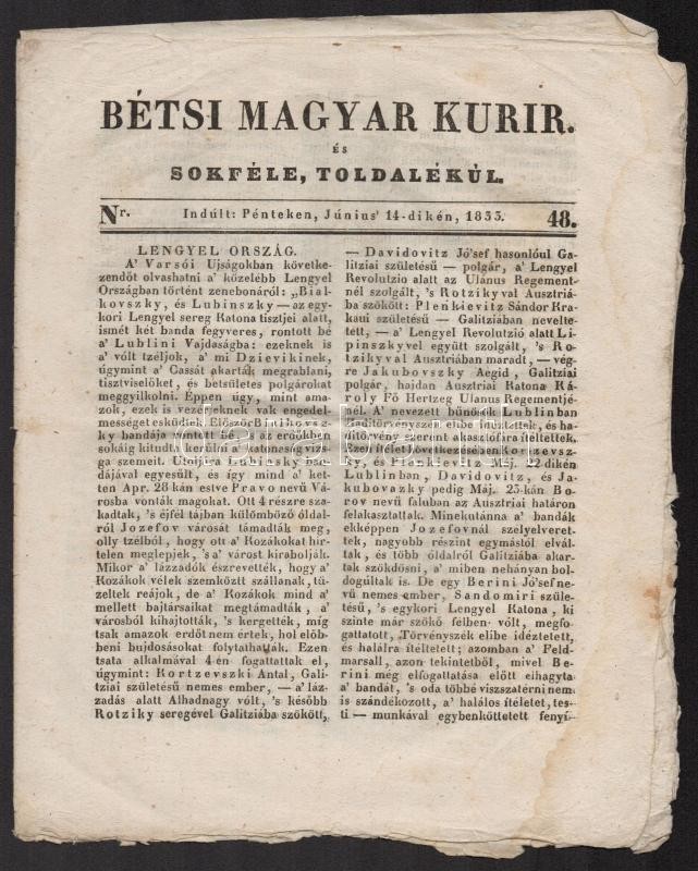 Leírás: 1833 Bétsi magyar kurír 48. száma, érdekes korabeli hírekkel számos országból