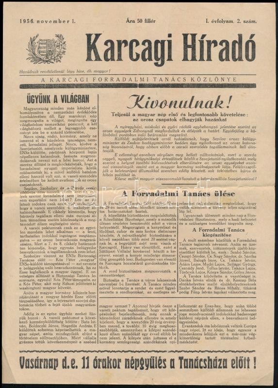 1956 Karcagi Híradó. A Karcagi Forradalmi Tanács közlönye. 1956. november 1. I. évf. 2. szám. Hajtásnyomokkal, de alapvetően jó állapotban, 2 sztl. lev.