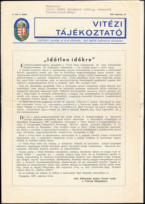 Leírás: 1972 a Vitézi tájékoztató emigrációs lap 1. évf. 1. lapszáma