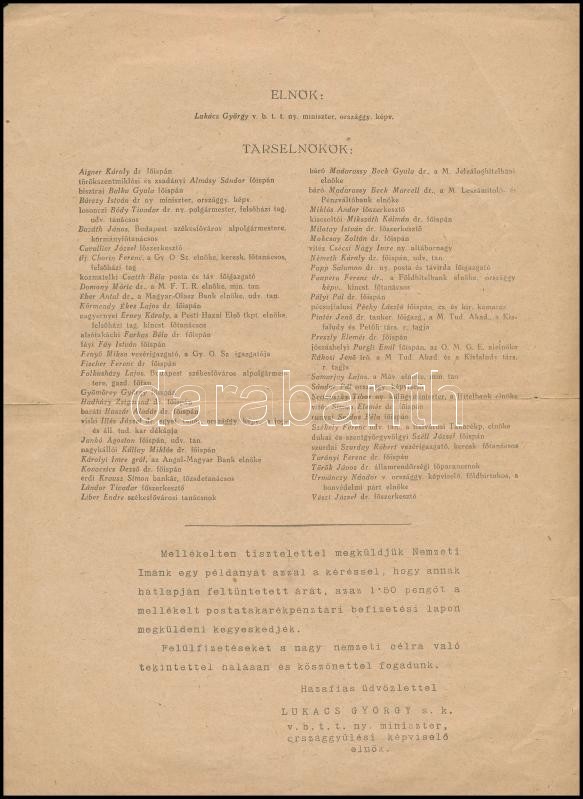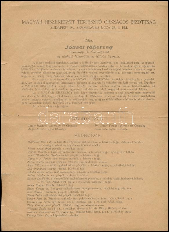 Leírás: cca 1928 a Magyar Hiszekegyet Terjesztő Országos Bizottság ismertető lapja, 2 p.