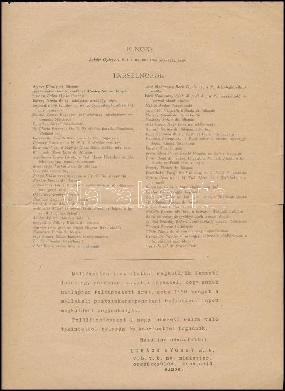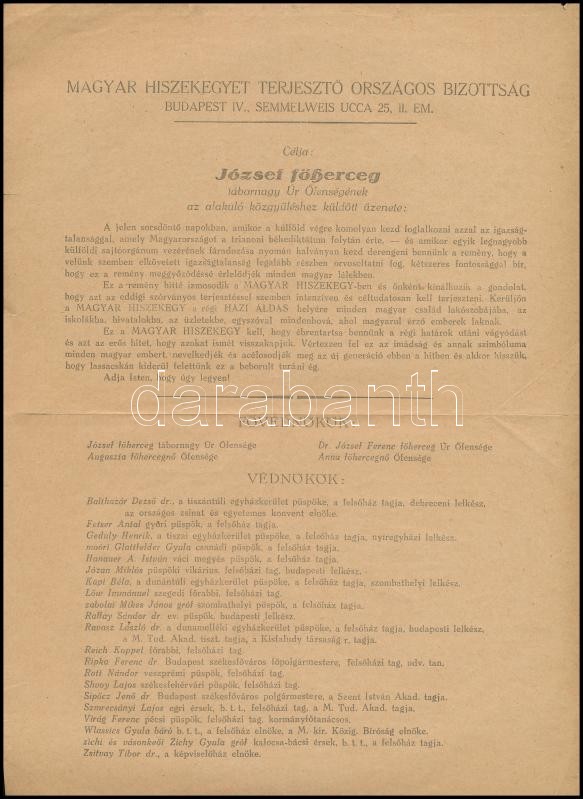 Leírás: cca 1928 a Magyar Hiszekegyet Terjesztő Országos Bizottság ismertető lapja, 2 p.