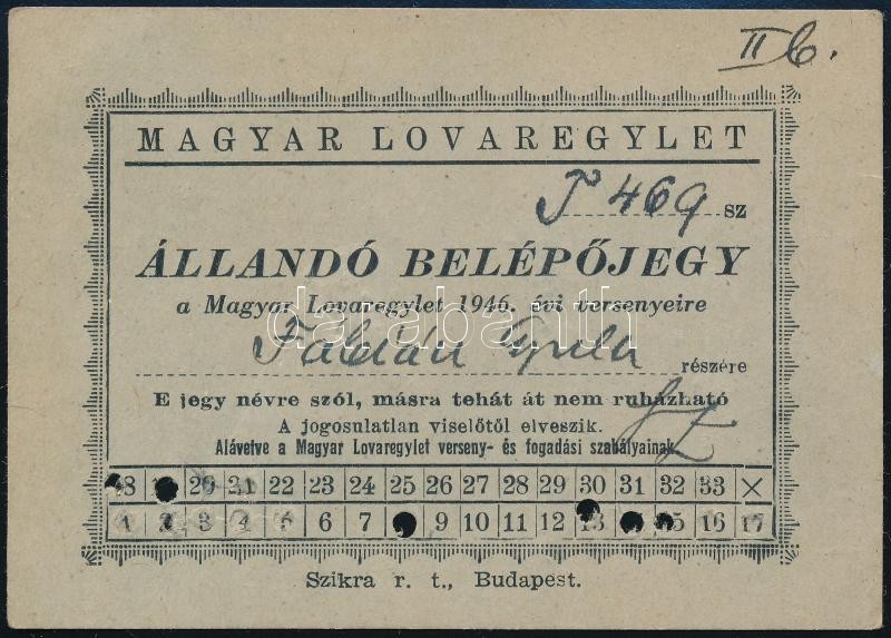 Leírás: 1946 a Magyar Lovaregylet éves állandó belépőjegye