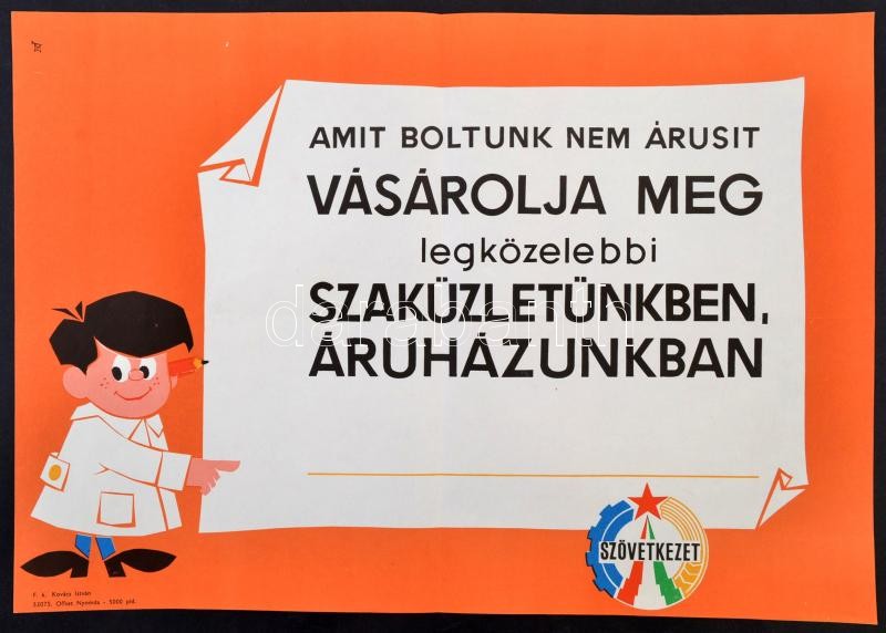 cca 1960 Amit boltunk nem árusít vásárolja meg legközelebbi szaküzletünkben, áruházunkban, Földművesszövetkezet reklám plakát, Offset Nyomda, kiadták 5000 példányban, hajtásnyomokkal, 33x47 cm.