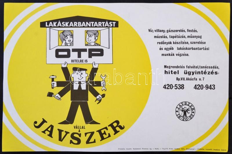 cca 1975 Kőszegi Judit (1944-): Lakáskarbantartást OTP hitelre is váll... https://www.darabanth.com/hu/304-Gyorsarveres/304.0/Festmeny-mutargy-papirregiseg-egyeb/Plakat~29/cca-1975-Koszegi-Judit-1944-Lakaskarbantartast-OTP-hitelre-is-vallal-a-Javszer-plakat-off~II1637820
