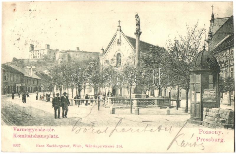 1899 Pozsony, Pressburg, Bratislava; Vármegyeház tér, háttérben a vár, Kertész Tódor reklám. gránátrepesz által sérült lap / Komitatshausplatz / county hall square, castle (damaged by grenade fragments) (b)