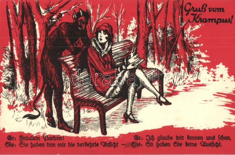 Krampus with lady. C. H. W. VIII/2. 2506-27. (EK) https://www.darabanth.com/hu/304-Gyorsarveres/304.0/Kepeslapok/Krampusz~300074/Krampus-with-lady-C-H-W-VIII2-2506-27-EK~II1636700