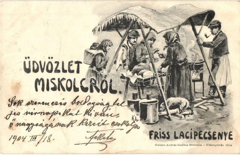 Miskolc, Friss lacipecsenye, piac. Gedeon András kiadása (EB) https://www.darabanth.com/hu/304-Gyorsarveres/304.0/Kepeslapok/Magyarorszag~300005/Miskolc-Friss-lacipecsenye-piac-Gedeon-Andras-kiadasa-EB~II1636496