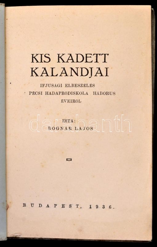 Bognár Lajos: Kis kadett kalandjai. Ifjusági elbeszélés pécsi hadapródiskola háborús éveiről. Bp., 1936, Admiral nyomdai műintézet. Kiadói kissé foltos papírkötés.