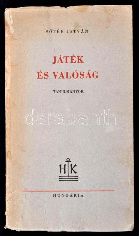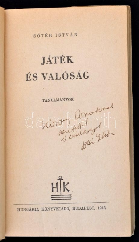Sőtér István: Játék és valóság. Tanulmányok. Bp., 1946, Hungária. Kiadói papírkötés. A szerző, Sőtér István (1913-1988) által dedikálva Kosáry Domokos (1913-2007) történésznek.