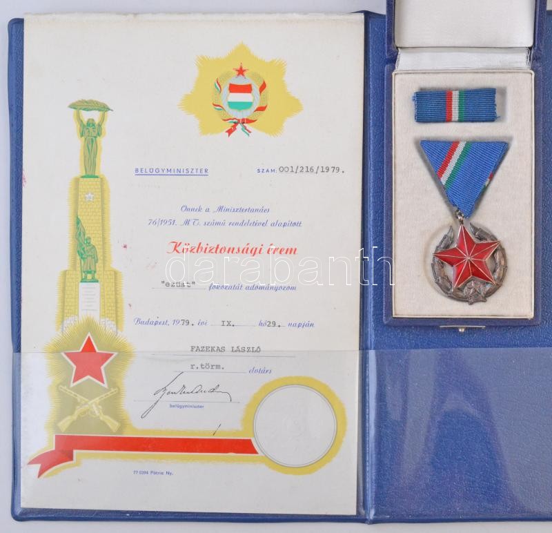 Leírás: 1979. "Közbiztonsági Érem" ezüst fokozata a rendőrség tagjai részére mellszalaggal, szalagsávval eredeti tokban + adományozói okirat T:2
