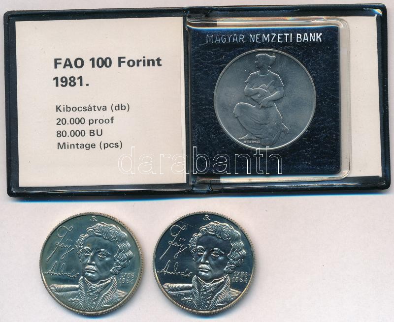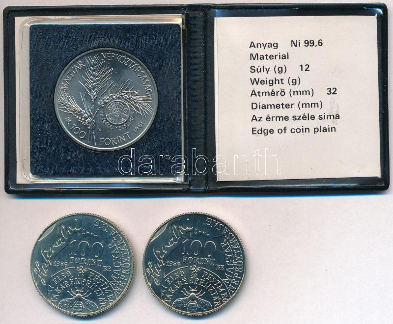 Leírás: 1981. 100Ft Ni "FAO I. - Világélelmezési nap" műbőr tokban tanúsítvánnyal + 1986. 100Ft alpakka "Fáy András" (2x) T:BU
