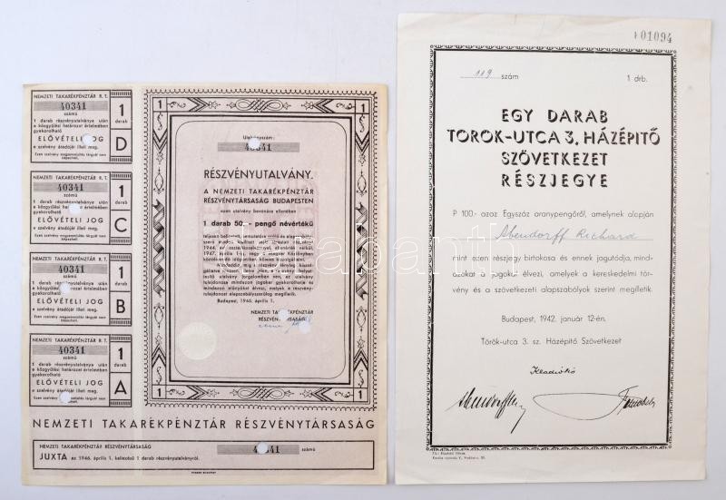 Leírás: Budapest 1942. "Török-utca 3. Házépítő Szövetkezet" részjegye 100 Aranypengőről, hátoldalán bélyegzés + 1946. "Nemzeti Takarékpénztár Részvénytársaság Budapesten" részvényutalvány 50P-ről, szárazpecséttel és szelvényekkel, lyukasztással érvénytelenítve T:II,II- szakadás