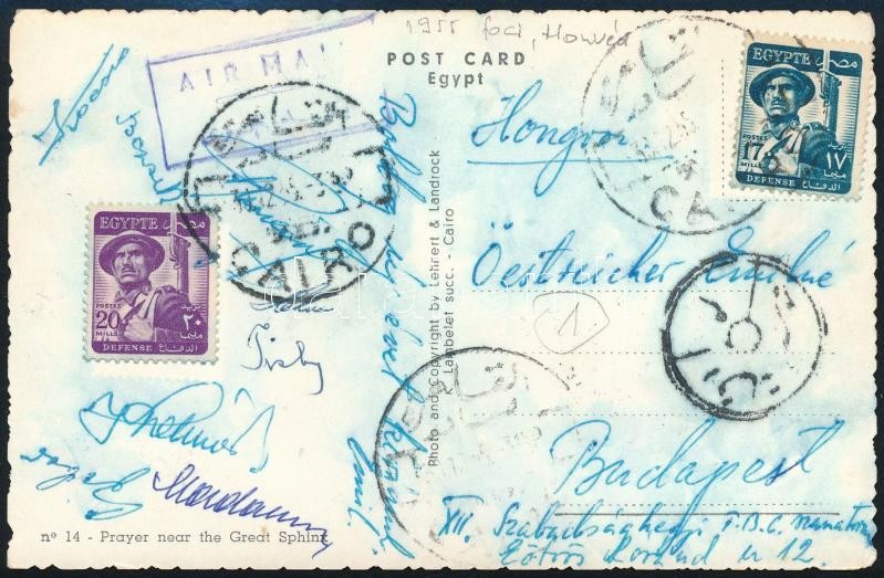 1955 A Honvéd labdarúgó csapat tagjai által aláírt képeslap. Kocsis, Bozsik, Czibor, Tichy, Oesterreicher Emil a csapat szakosztályvezetője, 1957-63 között a Real Madrid technikai igazgatója, ő vitte Puskást is oda. / HOnved footbal club team members signed postcard