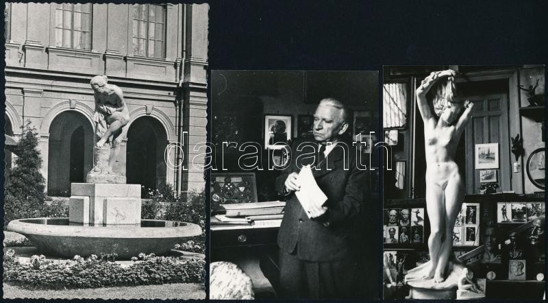 Leírás: Kisfaludy Stróbl Zsigmond (1884-1975) szobrászművész és művei, 2 db fotó és egy képeslap a művész saját kezű aláírásával és soraival, 11x8 és 14x10 cm