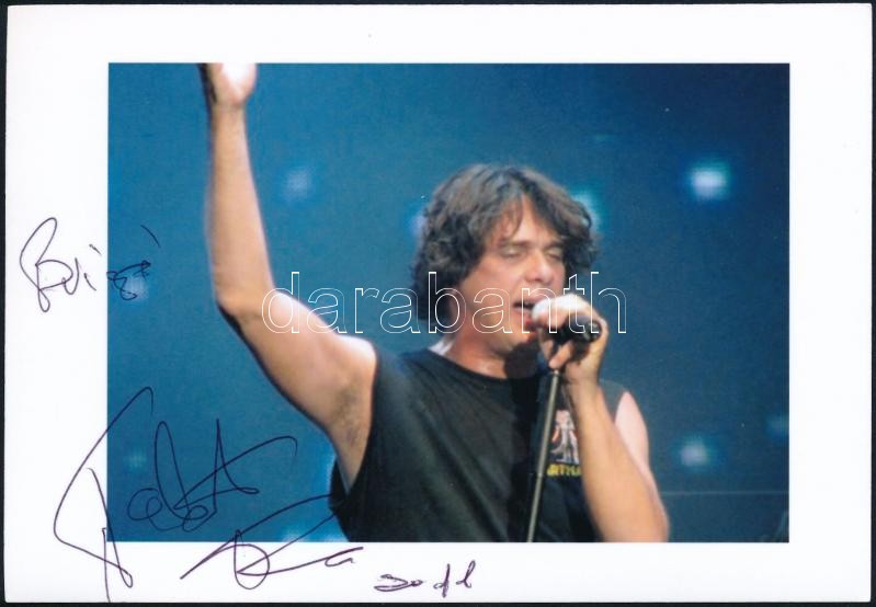 Leírás: Takáts Tamás (1957-) énekes, gitáros aláírása az őt ábrázoló képen