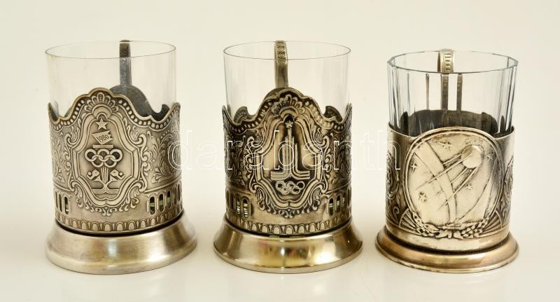 Leírás: 3 db retró fém pohártartó olimpia- ill. űrhajózás motívummal, üveg betéttel, m: 12 cm