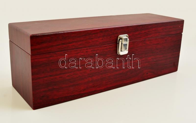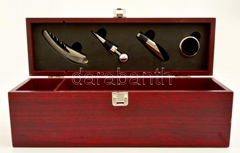 Leírás: Dekoratív fa borosüveg tartó, nyitókészlettel