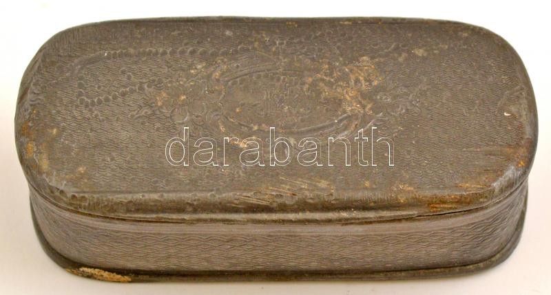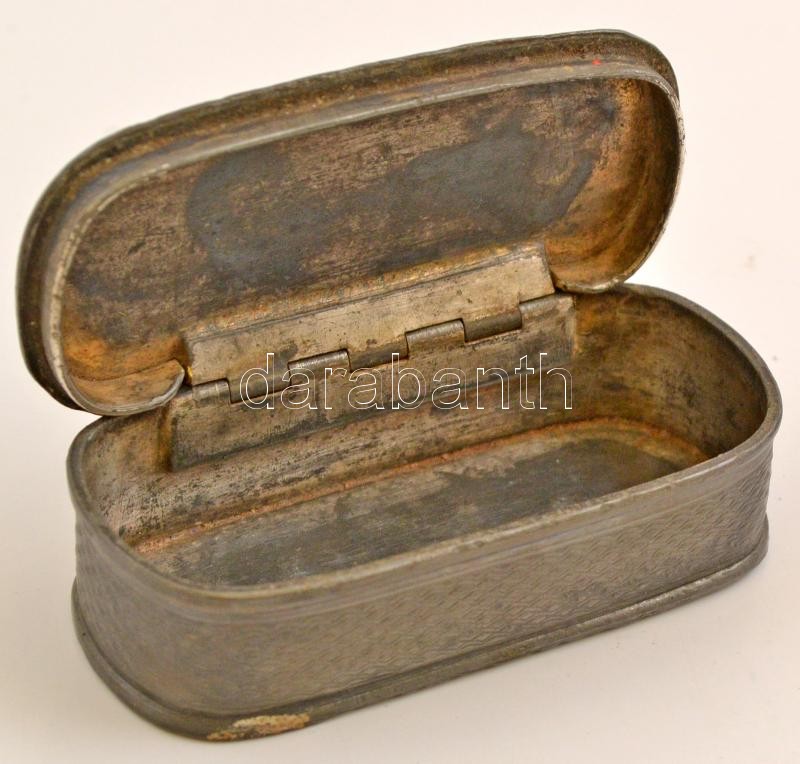 Leírás: Díszes ón tubákosszelence, 7,5×3,5×2,5 cm