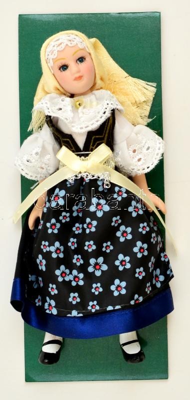 Leírás: Népviseletes baba dobozban, m: 20 cm