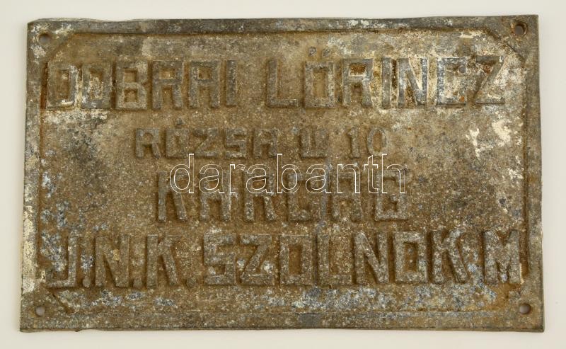 Leírás: cca 1930 Fém tábla Dobai Lőrincz Rózsa u. 10. Karcag, JNK Szolnok megye felirattal 27x16 cm