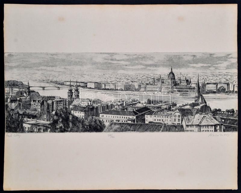 Leírás: Blahos Rudolf (1917-1986): Pesti látkép. Rézkarc, papír, jelzett, számozott, 50x18 cm