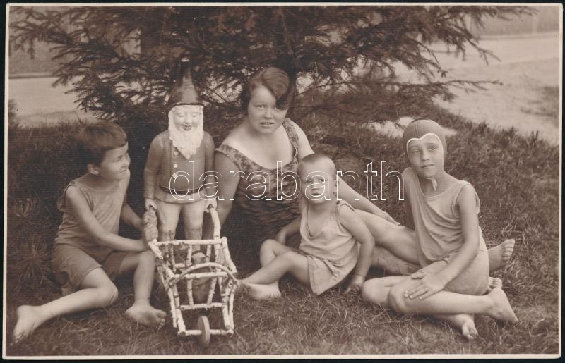 Leírás: cca 1910-1920 Család kerti törpével, fotólap, 8,5x13 cm