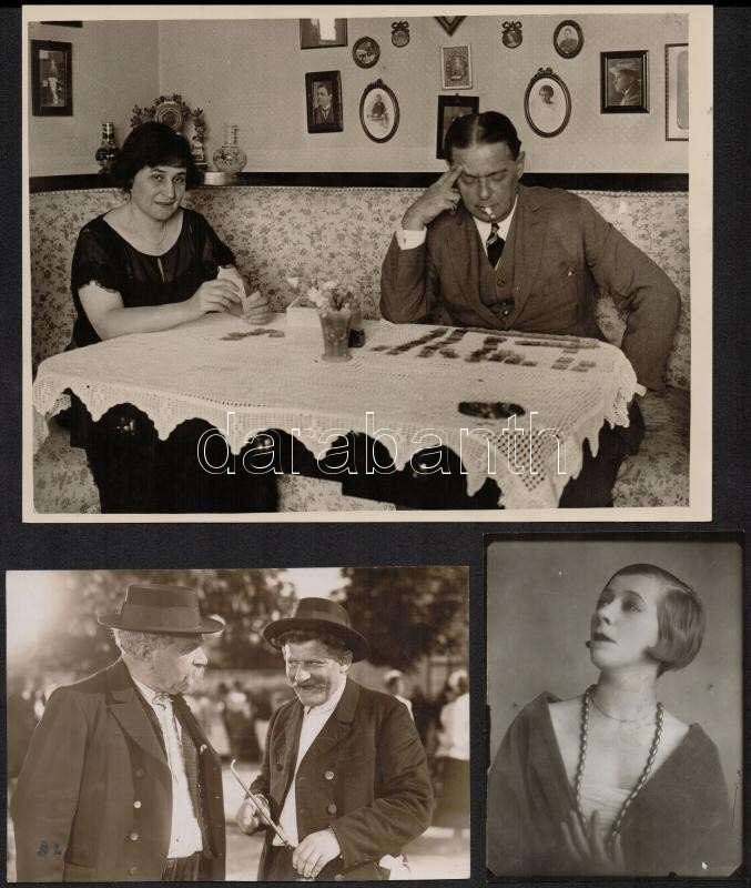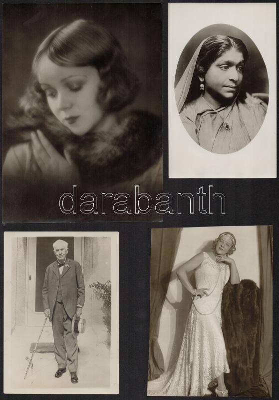 cca 1920-1940 12 db fotó magyar és külföldi színészekről, egy részük hátoldalán pecséttel jelzett, köztük Fedák Sári, Várkonyi Mihály, 13,5x8,5 és 23x29 cm közti méretben