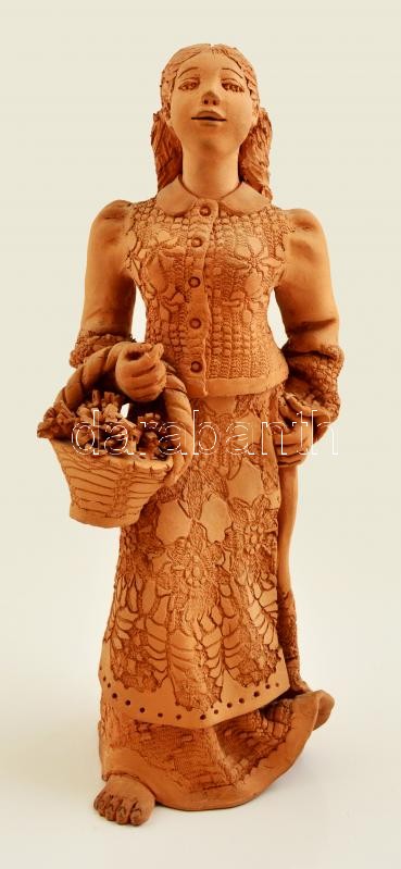 Leírás: Illár Erzsébet (1940- ): Lány virágkosárral. Égetett agyag, jelzett, jó állapotban, m:32 cm