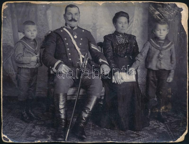 Leírás: cca 1900 Katona családjával, keményhátú műtermi fotó varsói műteremből, körbevágva, sérült, 11x15 cm