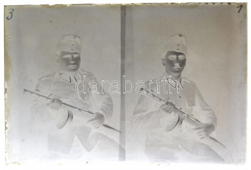 cca 1945 Magyar katonák dobtáras gépfegyverrel Hajdú János (?-?) csongrádi fényképész műtermében, 2 db vintage felvétel, közös üveglemez negatívon, 10x15 cm