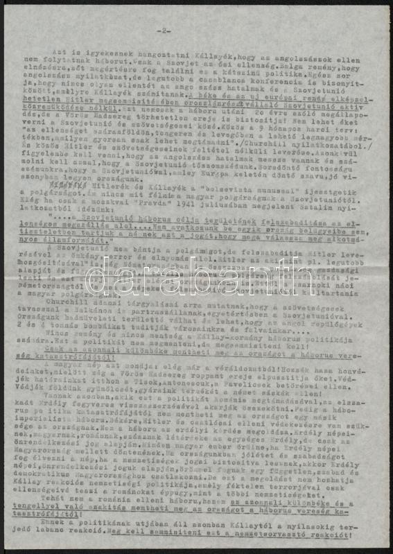 Leírás: 1943 A Kommunisták Magyarországi Pártjának felhívása a háború befejezésérő, a doni katasztrófát követően, röplap, 29x21 cm