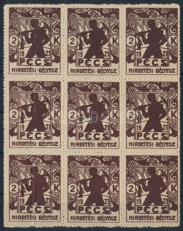 1921 Pécs 2K kilencestömb https://www.darabanth.com/hu/305-Gyorsarveres/305.0/Festmeny-mutargy-papirregiseg-egyeb/Okmanybelyegek~300015/1921-Pecs-2K-kilencestomb~II1645469