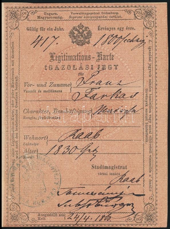 1860 Győr, Igazolási jegy, 15 kr okmánybélyeggel https://www.darabanth.com/hu/305-Gyorsarveres/305.0/Festmeny-mutargy-papirregiseg-egyeb/Okmanyok~300029/1860-Gyor-Igazolasi-jegy-15-kr-okmanybelyeggel~II1641553