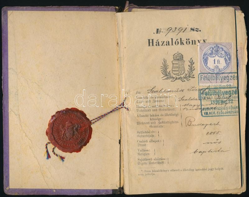 1896 2 db házalókönyv, megviselt állapotban https://www.darabanth.com/hu/305-Gyorsarveres/305.0/Festmeny-mutargy-papirregiseg-egyeb/Okmanyok~300029/1896-2-db-hazalokonyv-megviselt-allapotban~II1649291