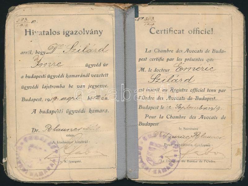 1919 Fényképes ügyvédi igazolvány https://www.darabanth.com/hu/305-Gyorsarveres/305.0/Festmeny-mutargy-papirregiseg-egyeb/Okmanyok~300029/1919-Fenykepes-ugyvedi-igazolvany~II1647567