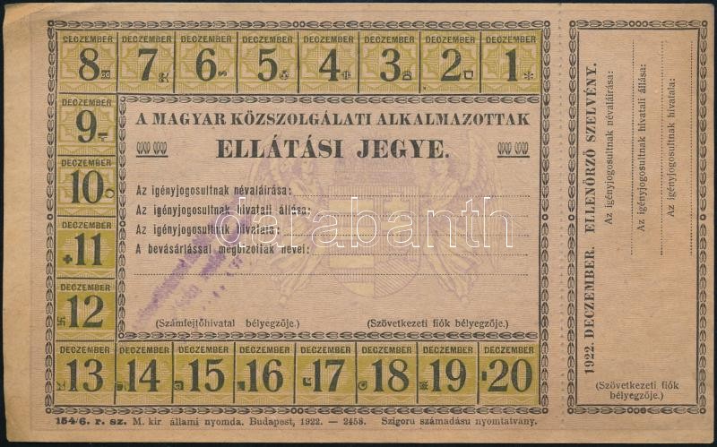 1922 Ellátási jegy, ellenőrző szelvénnyel https://www.darabanth.com/hu/305-Gyorsarveres/305.0/Festmeny-mutargy-papirregiseg-egyeb/Okmanyok~300029/1922-Ellatasi-jegy-ellenorzo-szelvennyel~II1648391