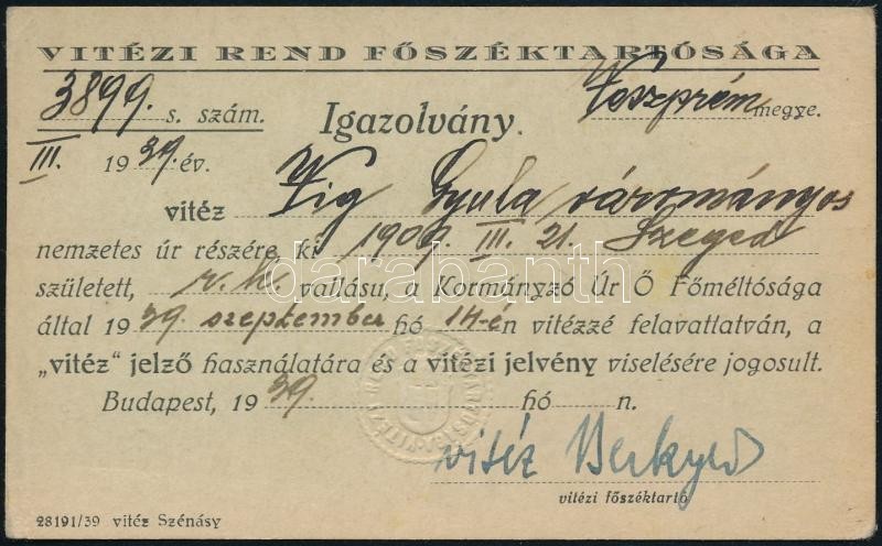 Leírás: 1939 Bp., A Vitézi Rend Főszékhatósága által kiállított igazolvány, mely feljogosít a vitéz jelző használatára és a jelvény viselésére