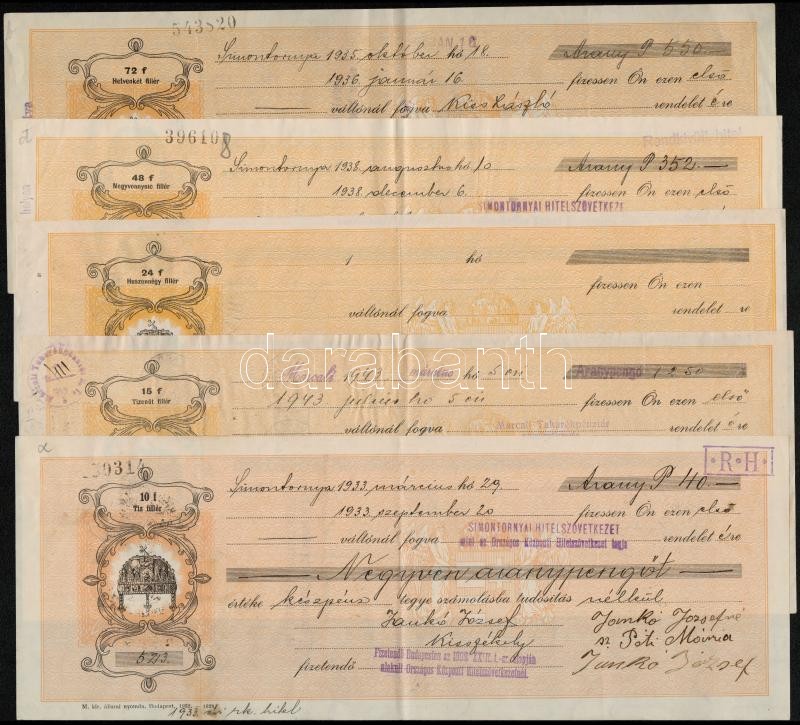 cca 1940 Váltók 10,15,24,48,72f Marcali, Simontornya bélyegzésekkel https://www.darabanth.com/hu/305-Gyorsarveres/305.0/Festmeny-mutargy-papirregiseg-egyeb/Okmanyok~300029/cca-1940-Valtok-10-15-24-48-72f-Marcali-Simontornya-belyegzesekkel~II1645740