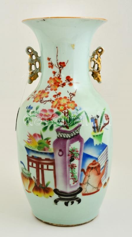 Leírás: Kínai kézzel festett padlóváza, 20.század eleje, jelzés nélkül, fogóján kopott aranyozással, m:41 cm